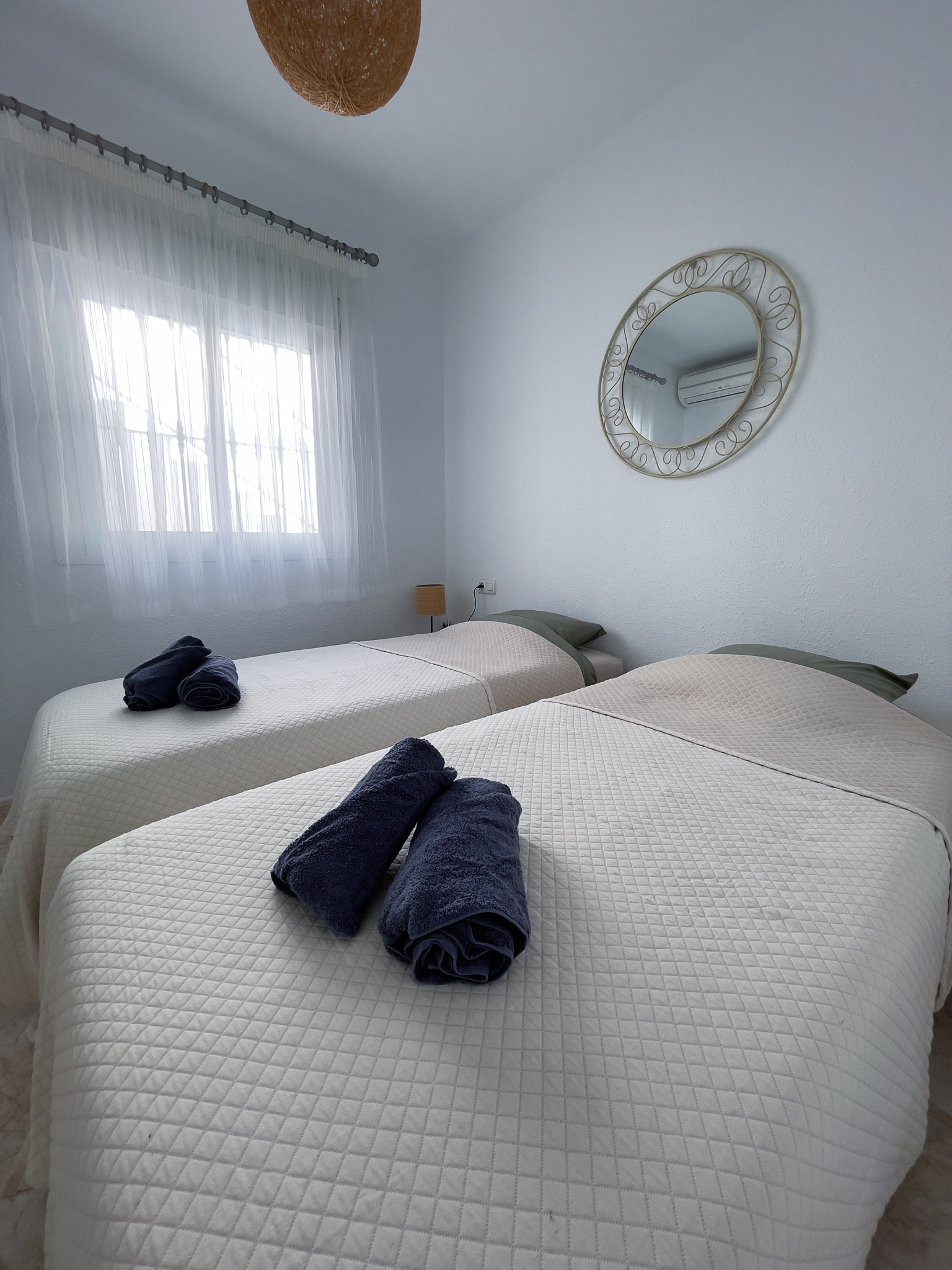 Slaapkamer 2: Twee eenpersoonsbedden (90×200) met directe toegang tot het terras en zwembad.